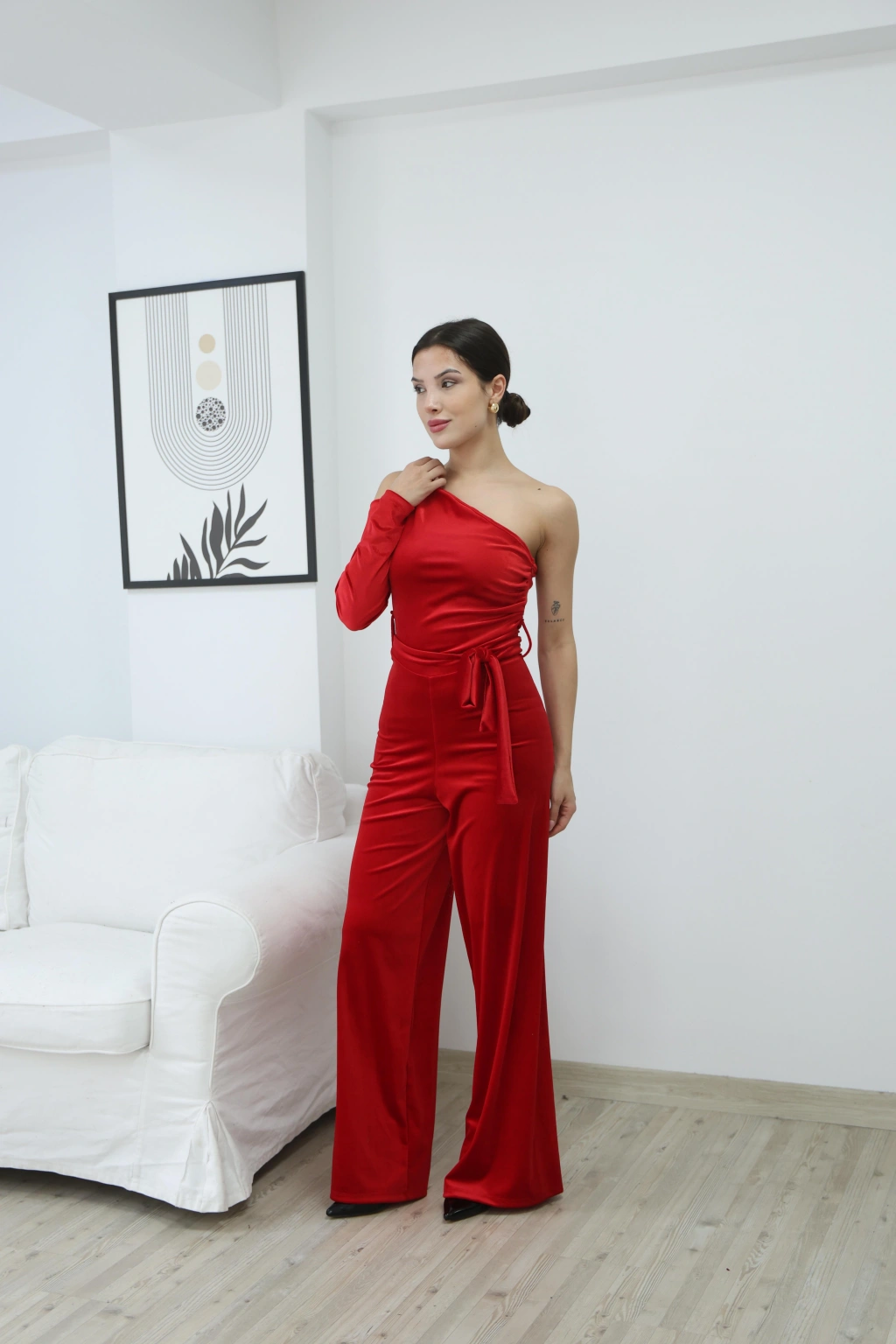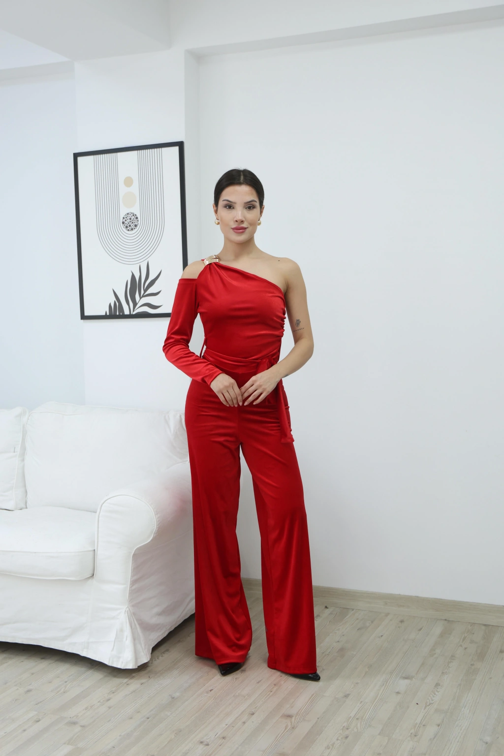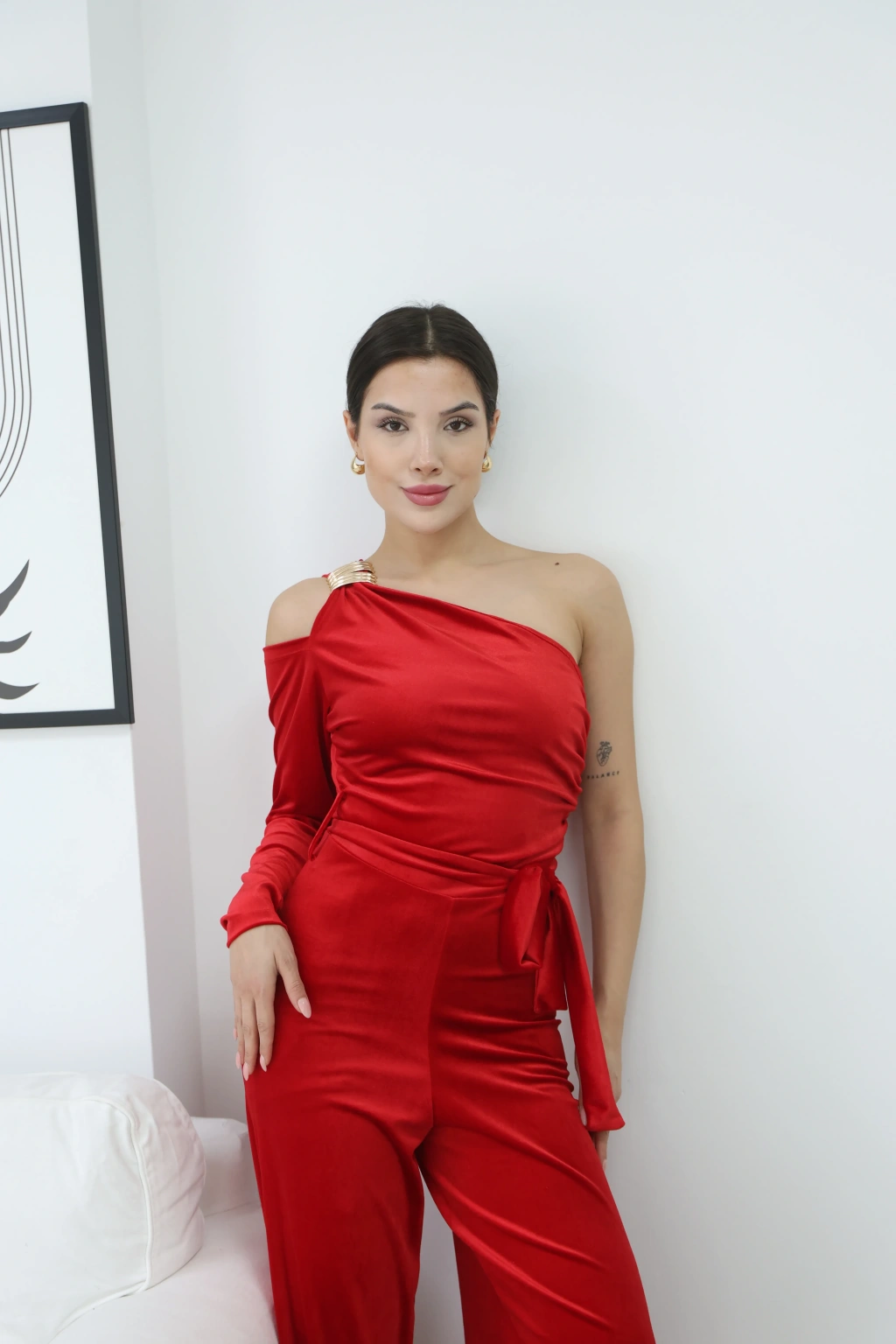 KADİFE PARLAK TEK OMUZ TULUM- KIRMIZI