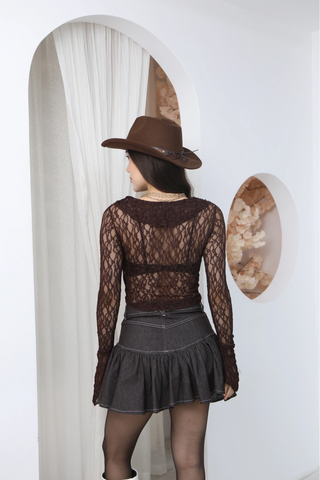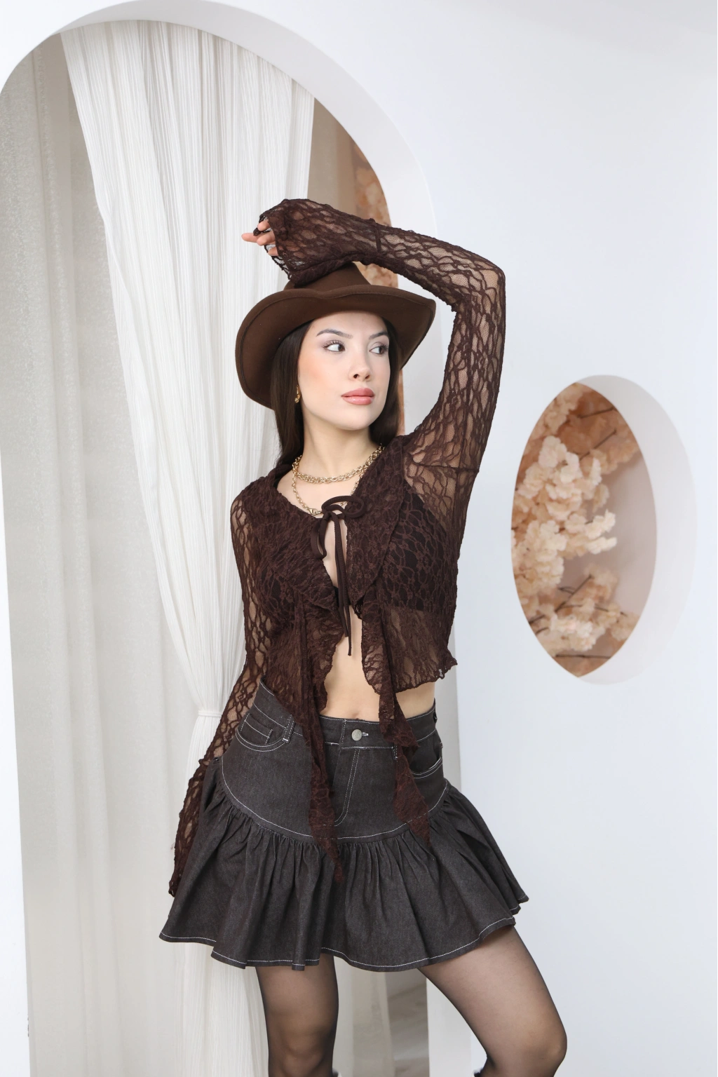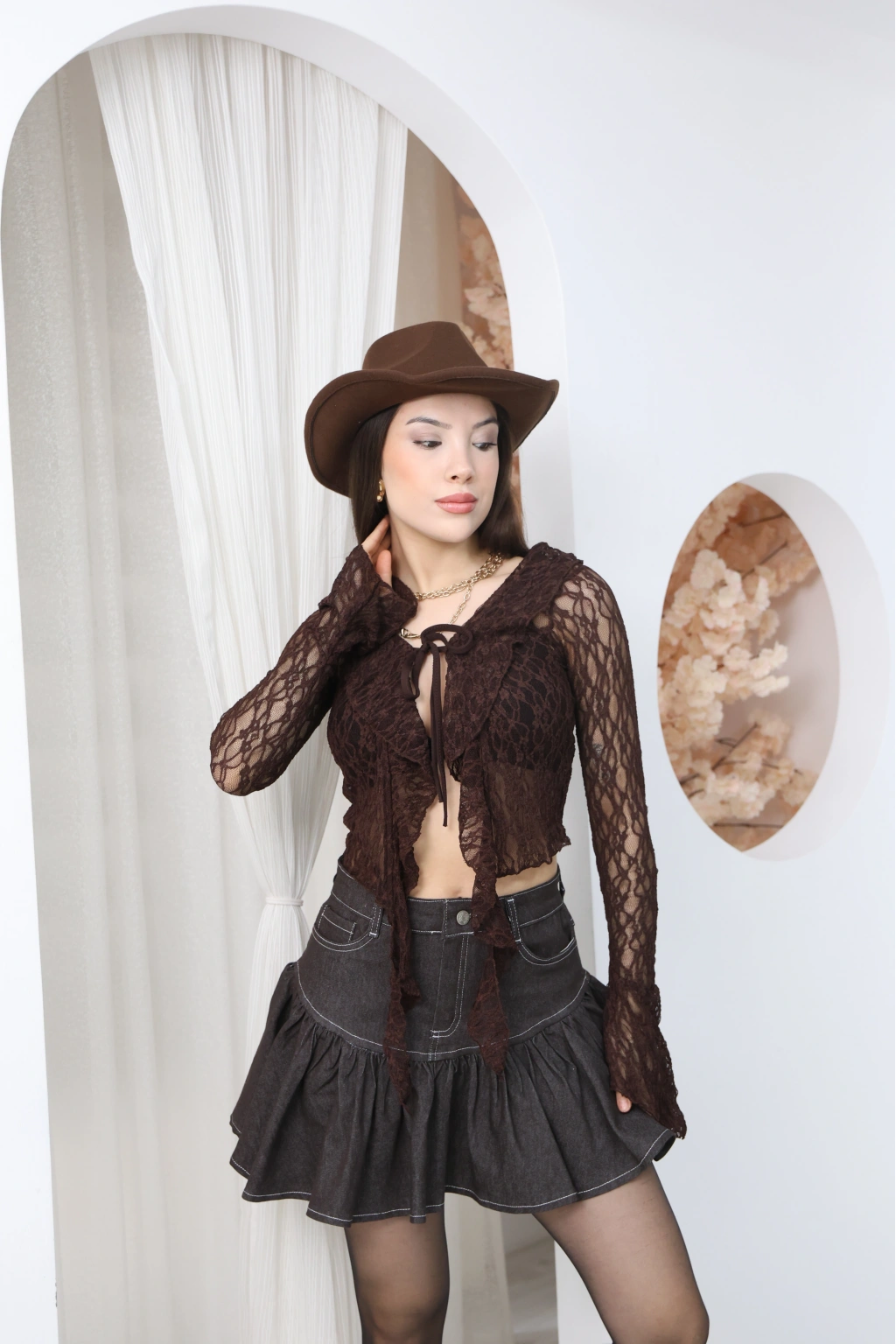 SIRT DANTEL DETAY MODAL BLUZ -KAHVE