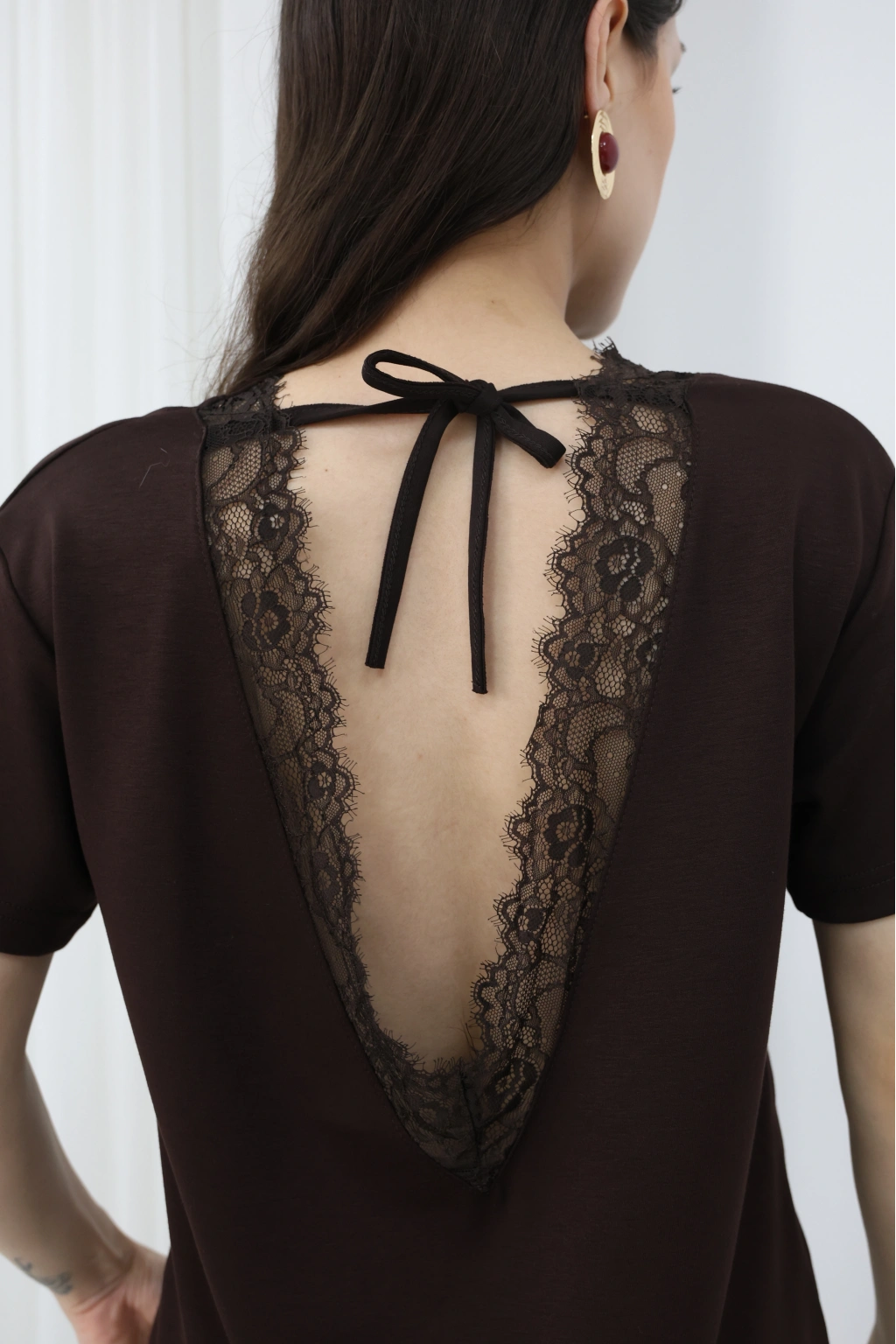 SIRT DANTEL DETAY MODAL BLUZ -KAHVE
