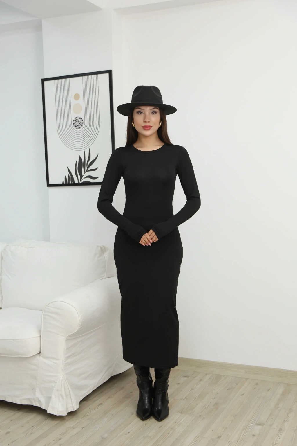 PARMAK GEÇİRMELİ ELBİSE-SİYAH